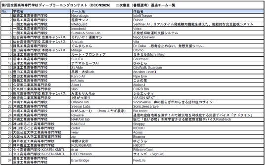 一般社団法人日本ディープラーニング協会(以下、「JDLA」)は、一般社団法人全国高等専門学校連合会、日本放送協会(NHK)、株式会社NHKエンタープライズの4団体で構成するDCON実行委員会が実施する高専生向け「ものづくり」とディープラーニングを活用した事業創出コンテスト「第7回 全国高等専門学校ディープラーニングコンテスト2026(以下、「DCON2026」)」において、二次審査(書類選考)を通過し、面談選考へ進む34チームを決定しました。