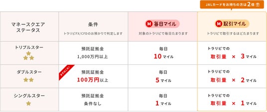株式会社マネースクエア(本社:東京都港区、代表取締役会長兼社長:相葉 斉)*、日本航空株式会社(本社:東京都品川区、代表取締役社長:鳥取三津子) は、新サービス「JALのマイルが毎日、たくさん、早く、たまるトラリピプログラム」を2026年2月2日(月)より開始します。