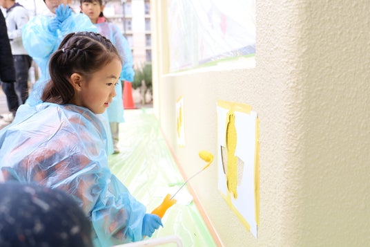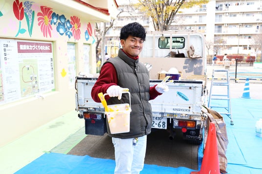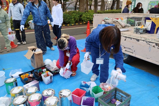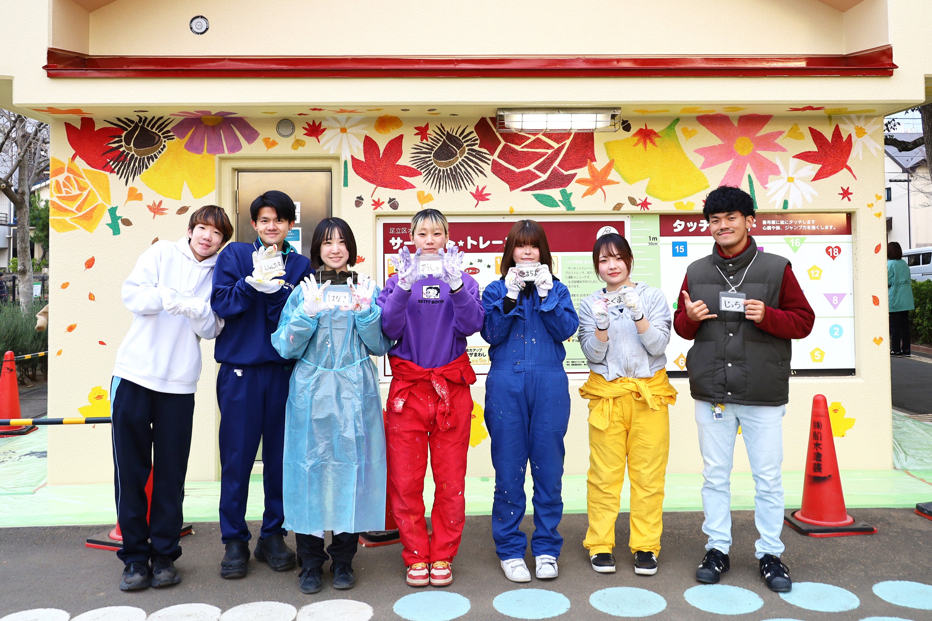文教大学教育学部美術専修の学生有志が東京都足立区の「あだちトイレアートProject」に参加し、同区花畑公園に設置されているトイレと遊具の塗装デザインの提案と実際の塗装作業を行いました。