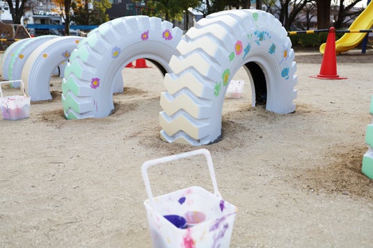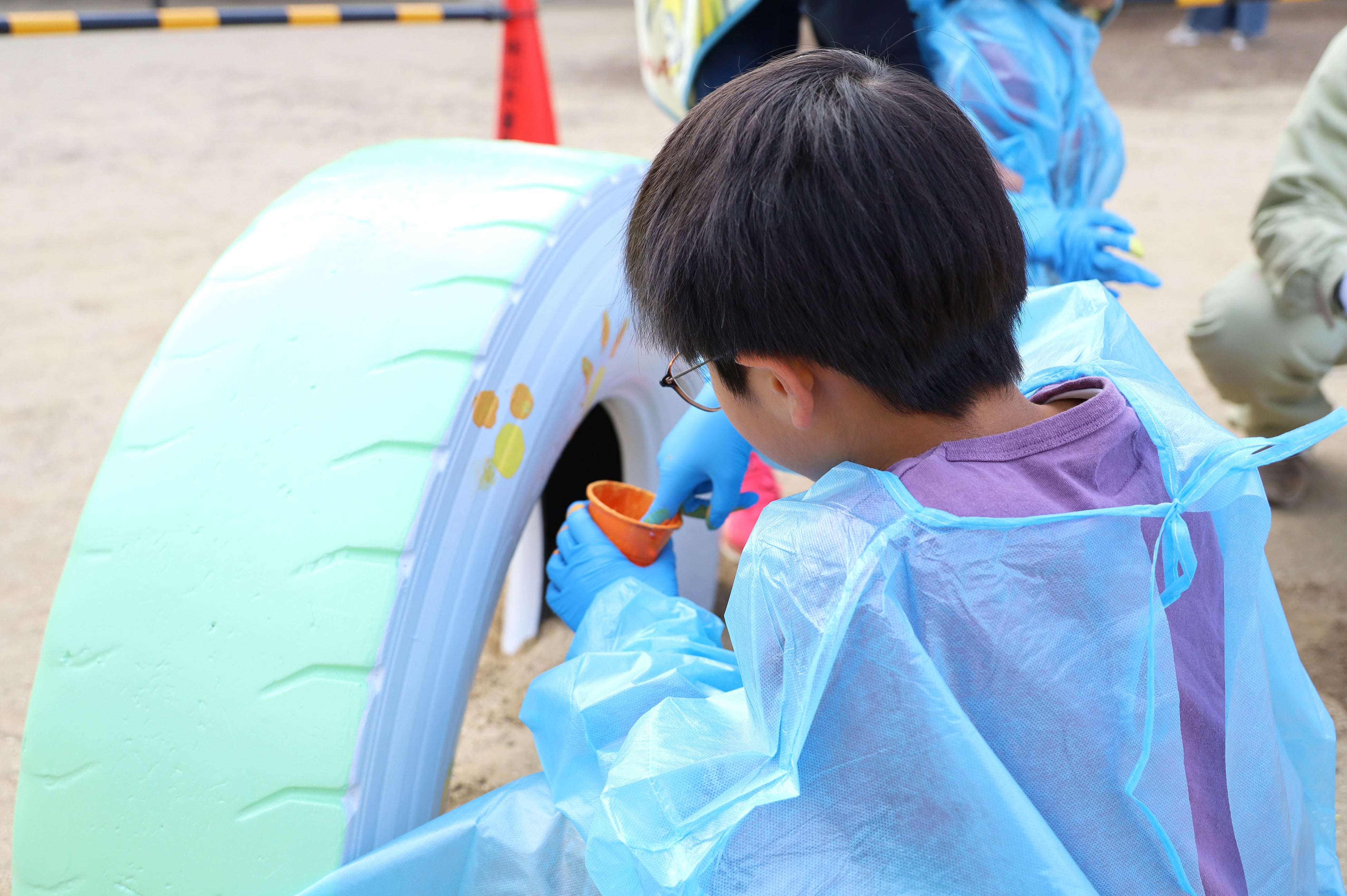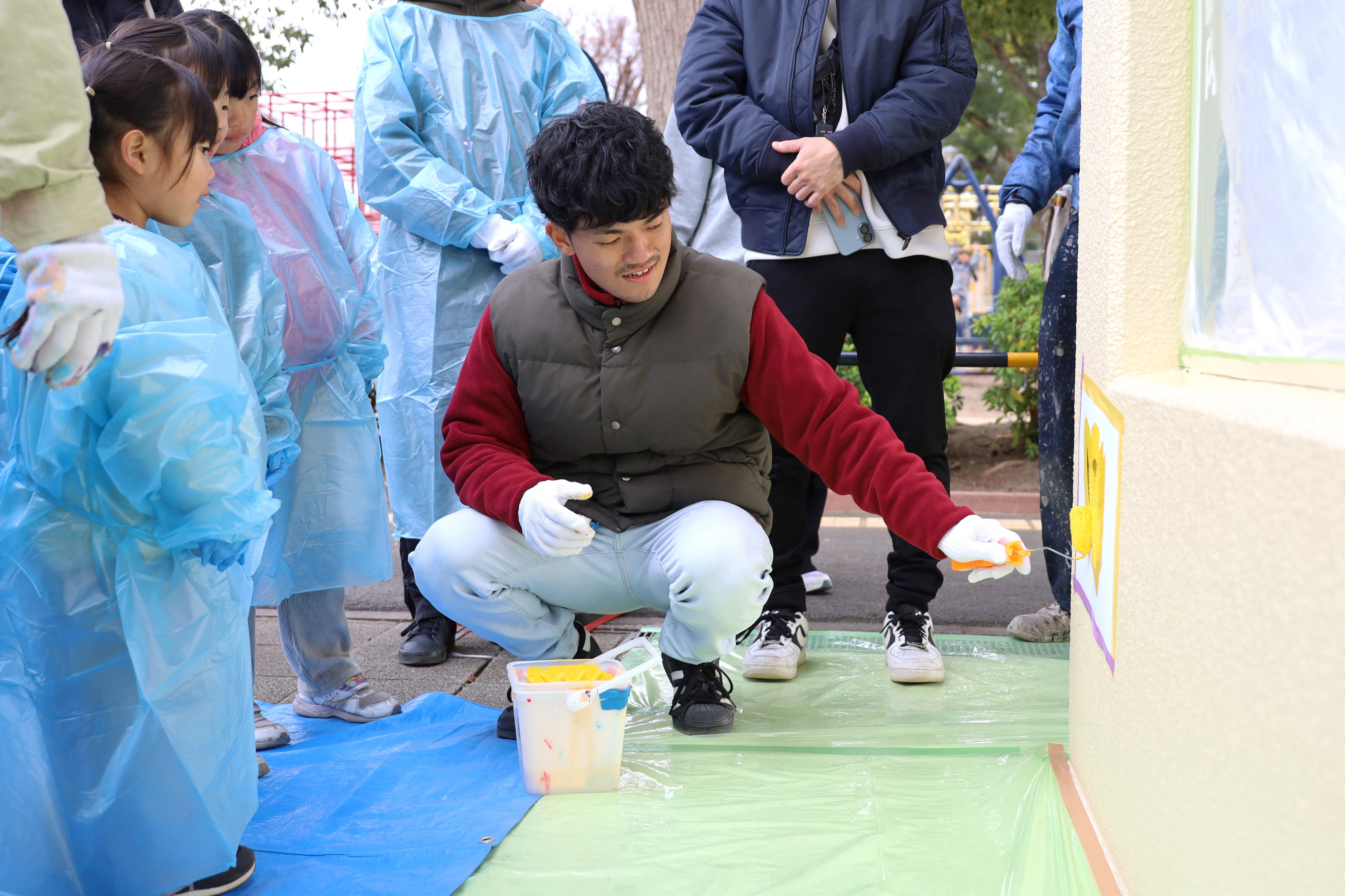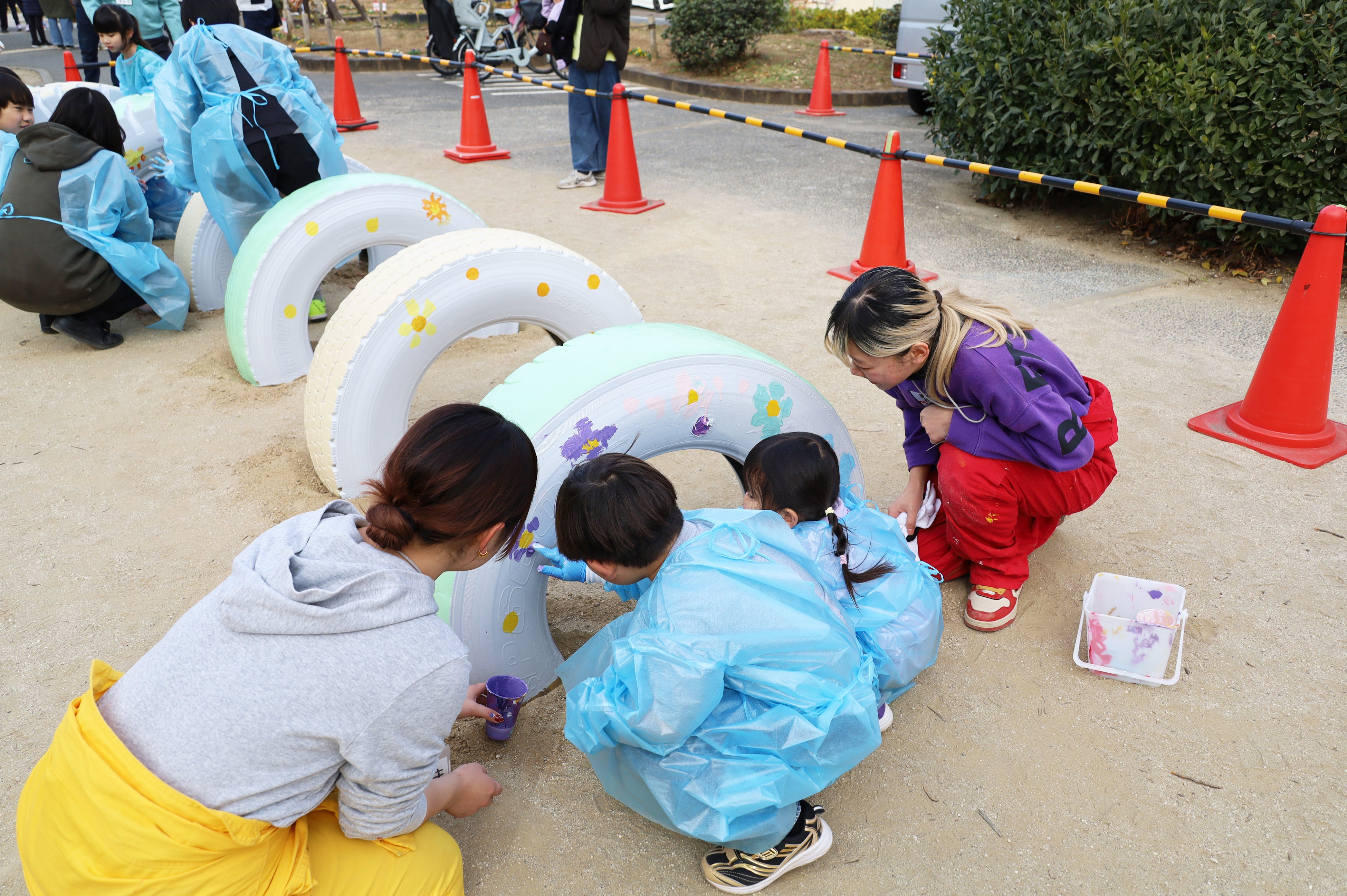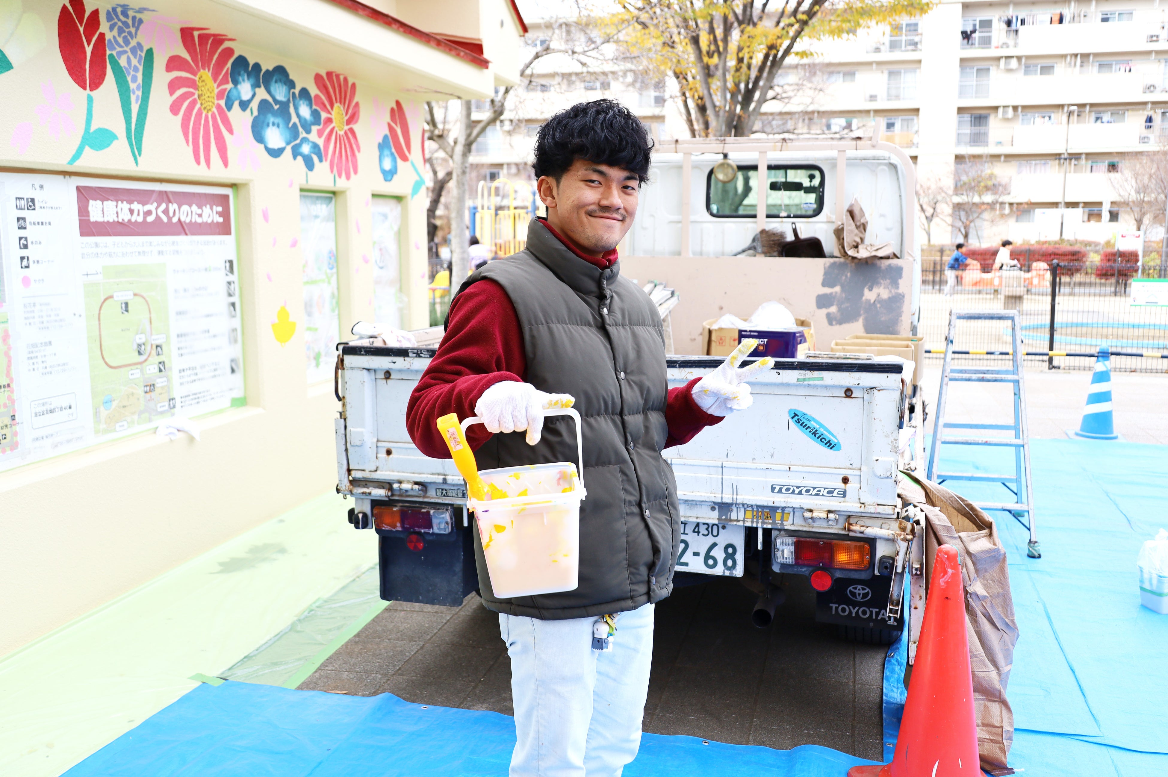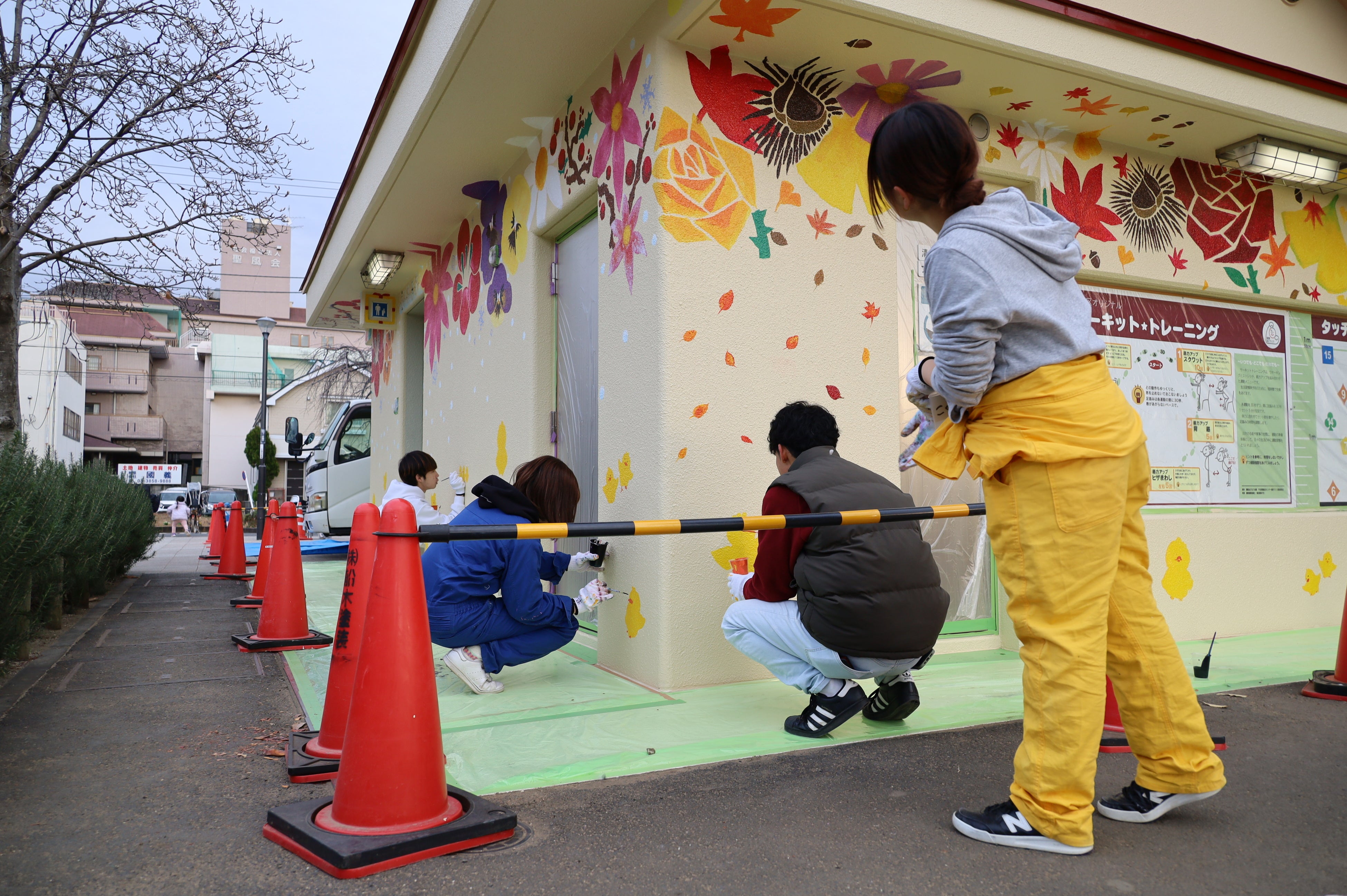 本プロジェクトに参加するにあたり、学生達は2025年の夏頃からデザインの検討を始め、四季折々の植物を楽しむことができる花畑公園の特徴から着想を得て、トイレの外壁に四季、タイヤの遊具に花を描くデザインを考案しました。実際の塗装作業は、株式会社船木塗装や、塗料を提供していただいた日本ペイント株式会社、副資材を提供していただいた森商事株式会社の協力のもと、2025年12月6日、7日、13日の3日間かけて行いました。13日には、地域の子ども達も塗装作業に参加しました。