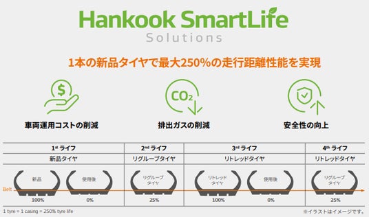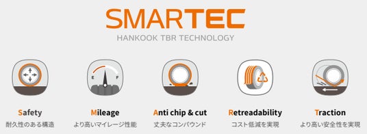 また、環境への配慮のため、ハンコック「SmartLifeソリューション」として、リグルーブおよびリトレッド可能な設計を採用し、タイヤの長期使用と再利用を促進することで、資源使用量の削減や環境負荷低減を実現します。