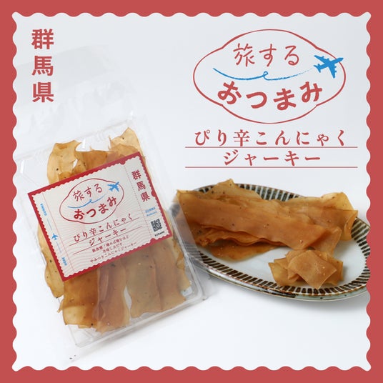 ぴり辛こんにゃくジャーキーこんにゃく芋の生産量全国1位を誇る名産地・群馬県で生まれた、こんにゃくの新たな美味しさを引き出したおつまみです。こんにゃくを甘じょっぱく味付け、セミドライにすることで、モチッとした食感に仕上げました。