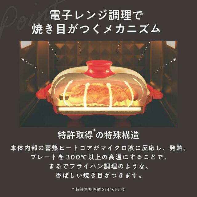 特殊発熱体である本体内部の蓄熱ヒートコアがマイクロ波に反応して発熱。短時間で300度以上の高温を実現するのだとか。
