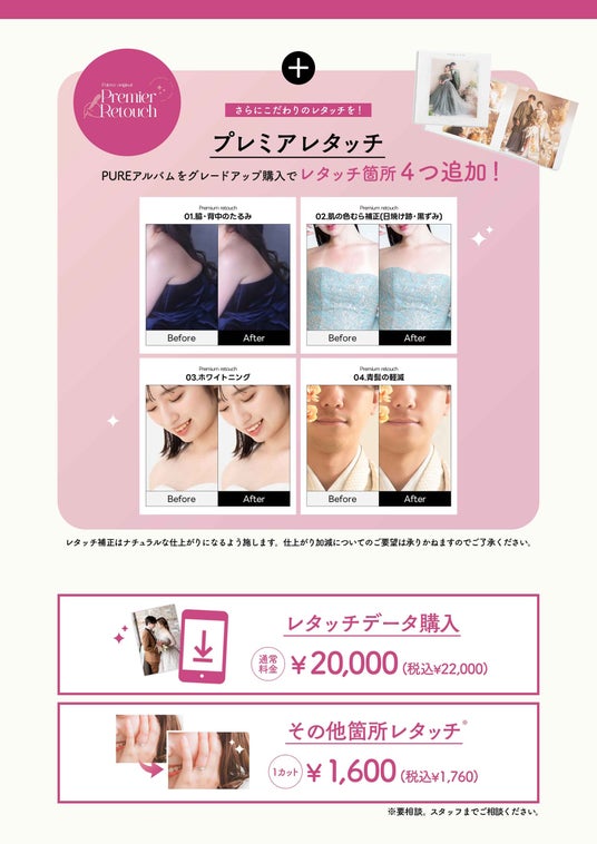 さらに、PUREアルバムをグレードアップ購入で、こだわりのレタッチが叶うプレミアレタッチがついてくる!プレミアレタッチ4箇所が追加され、合計10箇所のレタッチを施させていただきます。