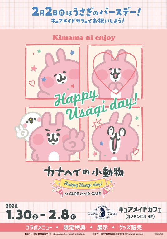 そのうさぎの誕生日2月2日をお祝いするコラボカフェ《カナヘイの小動物 Happy Usagi day! at CURE MAID CAFE》を、1月30日(金)からキュアメイドカフェ(CURE MAID CAFÉ)にて開催いたします。