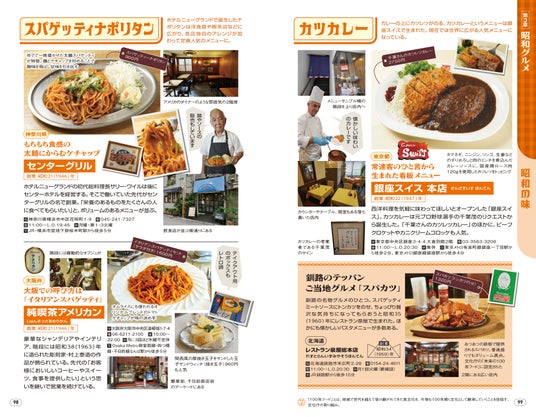 昭和に広まった洋食を中心に、料理が生まれた背景や発祥の店を紹介。老舗の味わいはもちろん、今も人々に親しまれる名物メニューをとおして、当時の食文化に触れられます。さらに、駄菓子店やドライブイン、自動販売機など、昭和の食風景を今に伝えるスポットも収録しました。