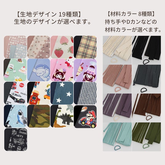 生地は19デザイン、副資材は8カラーから自由に組み合わせ可能。