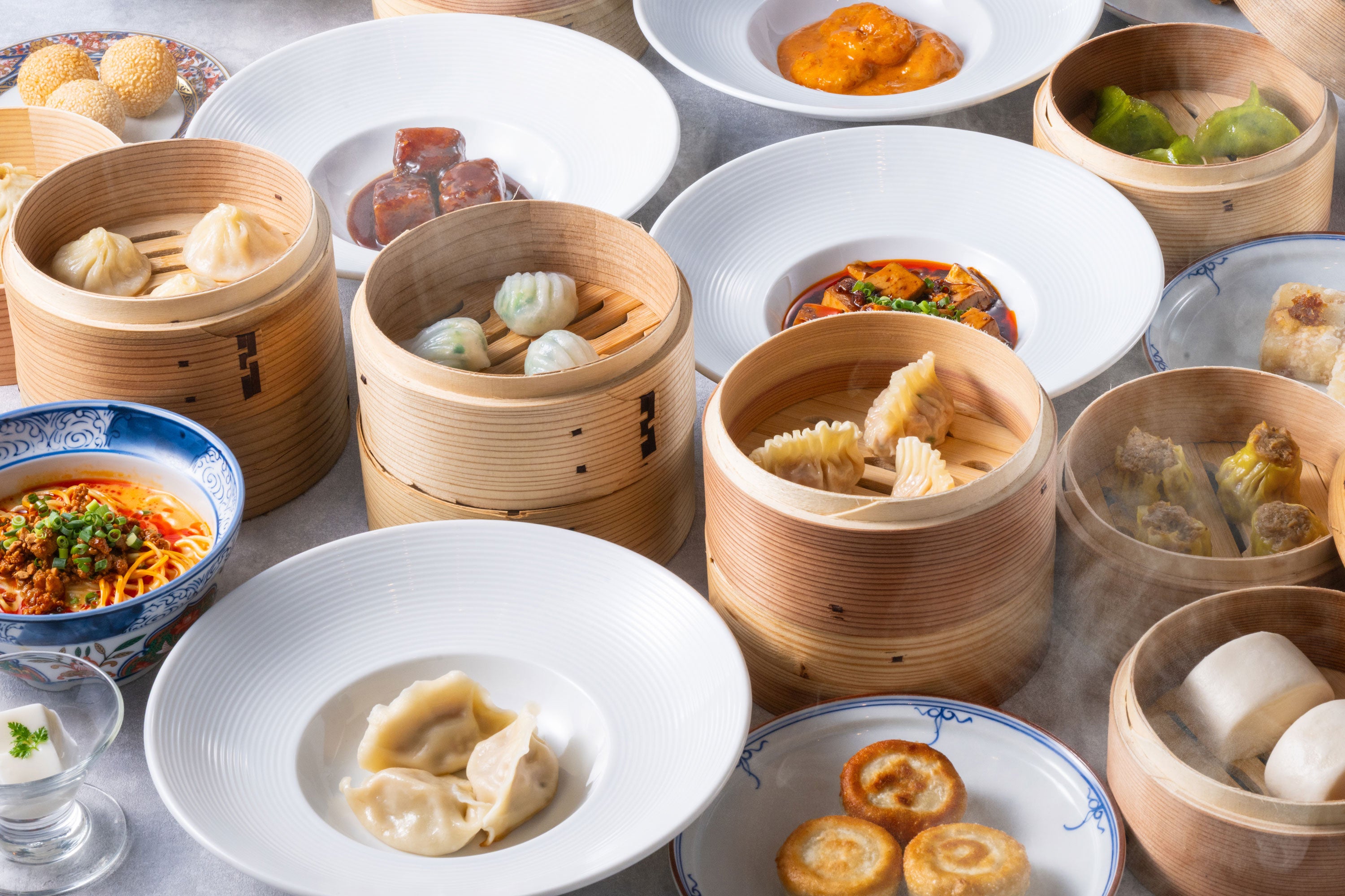 上海小籠包/白身魚と豆苗の蒸し餃子/フカヒレ蒸し餃子/水餃子の紅油ソース/自家製肉まん/ミルクパン