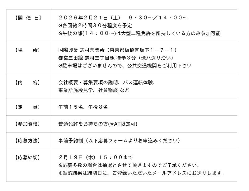路線バス・貸切バス・ホテルなどの事業を展開する国際興業株式会社(本社:東京都中央区、社長:黒滝寛)は、採用活動の一環として「バス運転体験&事業所見学ツアー」を2月21日(土)に志村営業所(東京都板橋区)にて開催いたします。過去に実施した説明会では、「実際に車両を動かす体験を通じて、バス運転士として働くイメージが明確になった」、「不安が解消でき、応募する決心がついた」などといった声が寄せられており、この説明会をきっかけに応募し、現在活躍している運転士もたくさんいます。