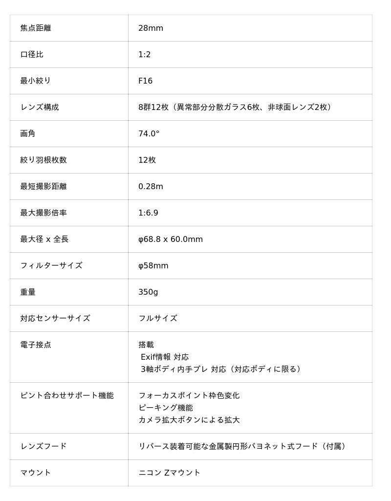 本製品は、フォクトレンダー史上最高性能の広角レンズとして、ニコンZマウントセンサーに最適化した極めて性能の高いフルサイズ(ニコンFXフォーマット)対応の交換レンズです。光の3原色を構成するRGBの軸上色収差を限りなくゼロに近づけるアポクロマート設計を採用し、各種の収差を徹底的に排除するとともに解像力やコントラスト再現性に関して究極の性能を追求。8群12枚構成のレンズには異常部分分散ガラス6枚、両面非球面レンズ2枚を投入し、フローティング機構も内蔵。最短撮影距離0.28mから遠距離まで破綻のない描写力を発揮し、28mm F2 という大口径広角レンズの価値観を一変させる性能を誇ります。
