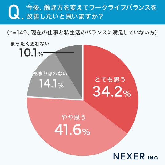 「とても思う」が34.2%、「やや思う」が41.6%となり、合計75.8%の人が働き方を変えてバランスを改善したいと考えていることがわかりました。現状に不満を持つ人の多くが、何らかの変化を望んでいるようです。