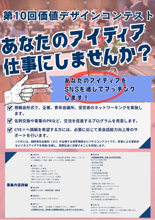 公益社団法人日本青年会議所では、今年で10回目の開催となるビジネスコンテスト「第10回価値デザインコンテスト」のエントリーを2026年3月31日(火)まで受け付け中です。