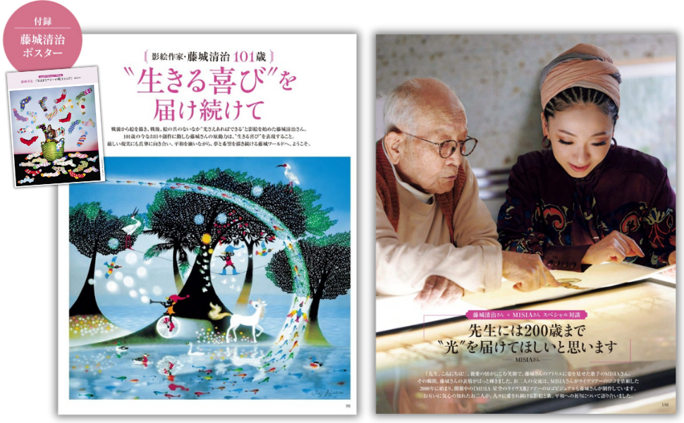 戦前から絵を描き、戦後、絵の具のないなか”光さえあればできる”と影絵を始めた藤城清治さん。101歳の今なお日々創作に勤しむ藤城さんのアトリエへから、平和を願いながら、夢と希望を描き続ける藤城ワールドをお届けします。ライヴツアーのロゴの制作をきっかけに親交を深める歌手・MISIAさんとのスペシャル対談、戦後80年の特別プロジェクトで藤城さんと平和について語り合った櫻井翔さんのスペシャルインタビューも必見です。特別付録には、藤城清治さんのポスターも。※付録のポスターは通常版とプレミアムライト版で絵柄が異なります。