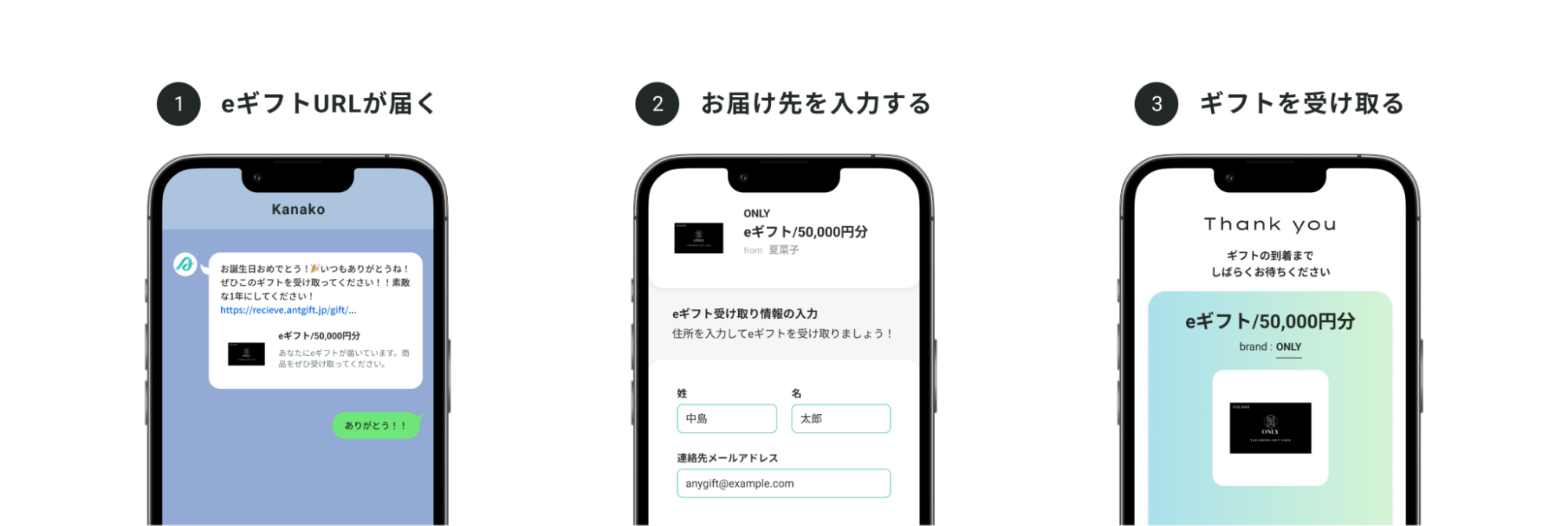 今回、当社のAnyGiftの機能を活用したeギフトサービス/物理ギフトカードの提供により、ONLYの店舗でご利用いただける「¥10,000/¥30,000/¥50,000の3種類のe Gift Card/ギフトカード」が贈れるようになります。