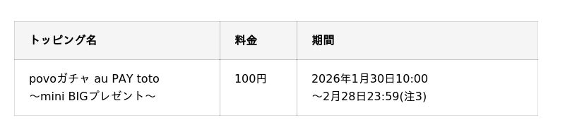 ■「povoガチャ au PAY toto ~mini BIGプレゼント~」について