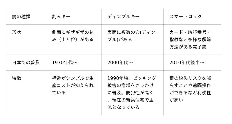 玄関鍵の種類には地域差があるが、全体では「刻みキー」と「ディンプルキー」が拮抗