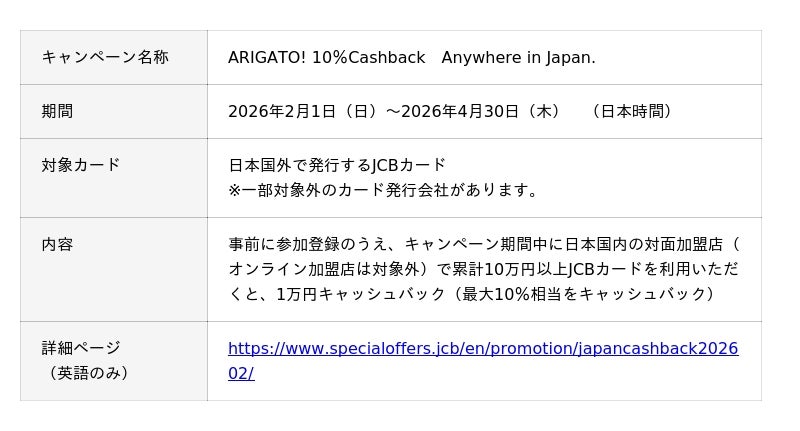 日本発唯一の国際カードブランド運営会社である株式会社ジェーシービー (本社:東京都港区、代表取締役会長 兼 執行役員社長:二重 孝好) 及び海外業務を行う子会社、株式会社ジェーシービー・インターナショナル(本社:東京都港区、代表取締役社長:陽川 勝樹)(以下、総称してJCB)は、海外のJCBカード会員様向けに日本でJCBカードを利用いただくと、10%キャッシュバックを行うキャンペーンを2026年2月1日(日)から開始します。