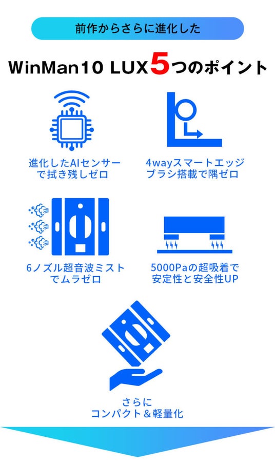 その実績とユーザーの声をもとに、AI&センサー制御や5000Paの超吸着などを強化した改良版モデルとして開発されたのが「WinMan10 LUX」です。