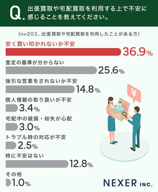 「安く買い叩かれないか不安」が36.9%で最多でした。次いで「査定の基準が分からない」が25.6%、「強引な営業をされないか不安」が14.8%となりました。
