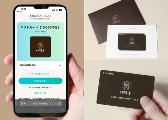 株式会社オンリー(本社所在地:京都市、代表取締役:中村 直樹)は、AnyReach株式会社(本社:東京都港区、代表取締役:中島 功之祐)が展開するギフトサービス『AnyGift(エニーギフト)』の機能を活用したeギフトサービス/ギフトカードを全国の「ONLY」店舗とオンラインストアにて発売を開始しました。