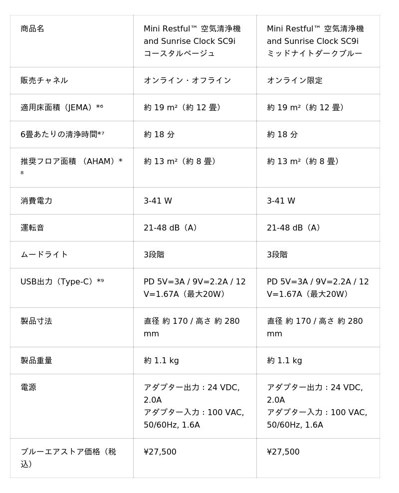 *⁴ Mini Restful(TM) 空気清浄機 and Sunrise Clock SC9i 「ナイトモード」運転時、21dB(A)。