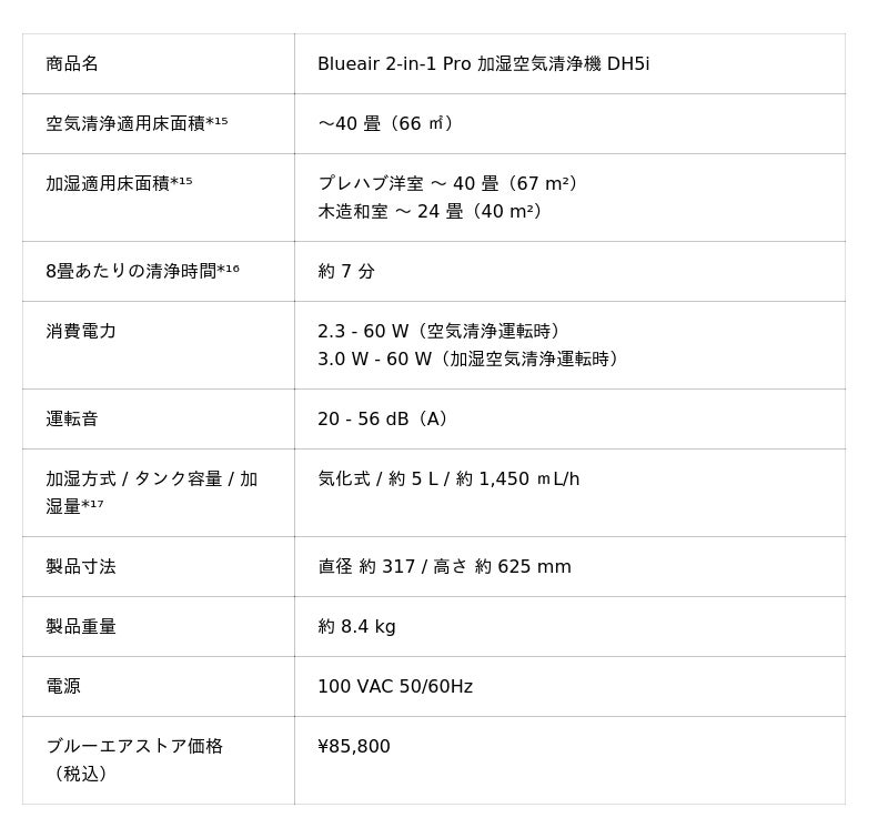 ■Blueair 2-in-1 Pro 加湿空気清浄機 DH5i 製品仕様