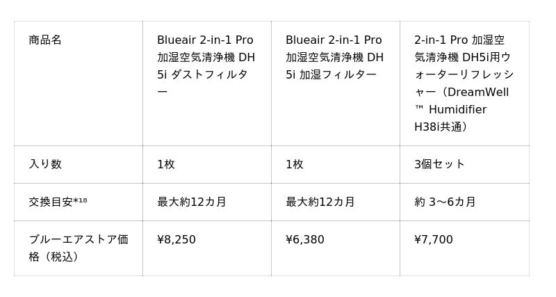 *¹¹ 数値はいずれも現行モデル「Blueair 2-in-1 加湿空気清浄機 DH3i」との比較による参考値です。サイズ:DH5i(直径317×高さ625mm)と DH3i(幅305×奥行340×高さ660mm)を比較し、体積比で約28%小型化。加湿量:DH5i(1,450mL/h)と DH3i(730mL/h)を比較し、約2倍。日本電機工業会規格 JEM1426 に基づく測定。加湿フィルター寿命:当社評価基準に基づく試算で約2.5倍。寿命は「加湿性能が初期値の50%を下回るまでの期間」と定義。(DH3i:約6か月[1日8時間運転・総運転時間 約1,440時間]、DH5i:約12か月[1日10時間運転・総運転時間 約3,600時間]、1か月を30日として算出)