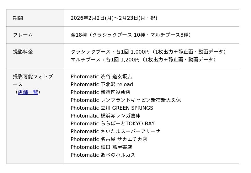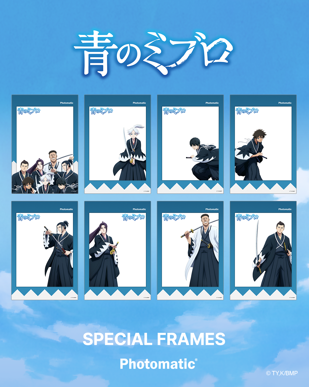 キタムラ・ホールディングス グループのピックハイブ株式会社(本社:東京都新宿区、代表取締役社長 兼 COO:大迫 由典)が運営するセルフフォトブランド「Photomatic(読み:フォトマティック)」は、TVアニメ『青のミブロ』とのコラボレーションを2026年2月2日(月)より期間限定で実施します。今回のコラボレーションは、現在放送中のアニメ第二期『青のミブロ-芹沢暗殺編-』が盛り上がりを見せるタイミングで、全国各地のファンが作品の世界観をより身近に体験できる機会としてフォトブースをご利用いただけます。コラボレーションフレームは全18種。ぜひ期間中にお好きなフレームで撮影をお楽しみください。