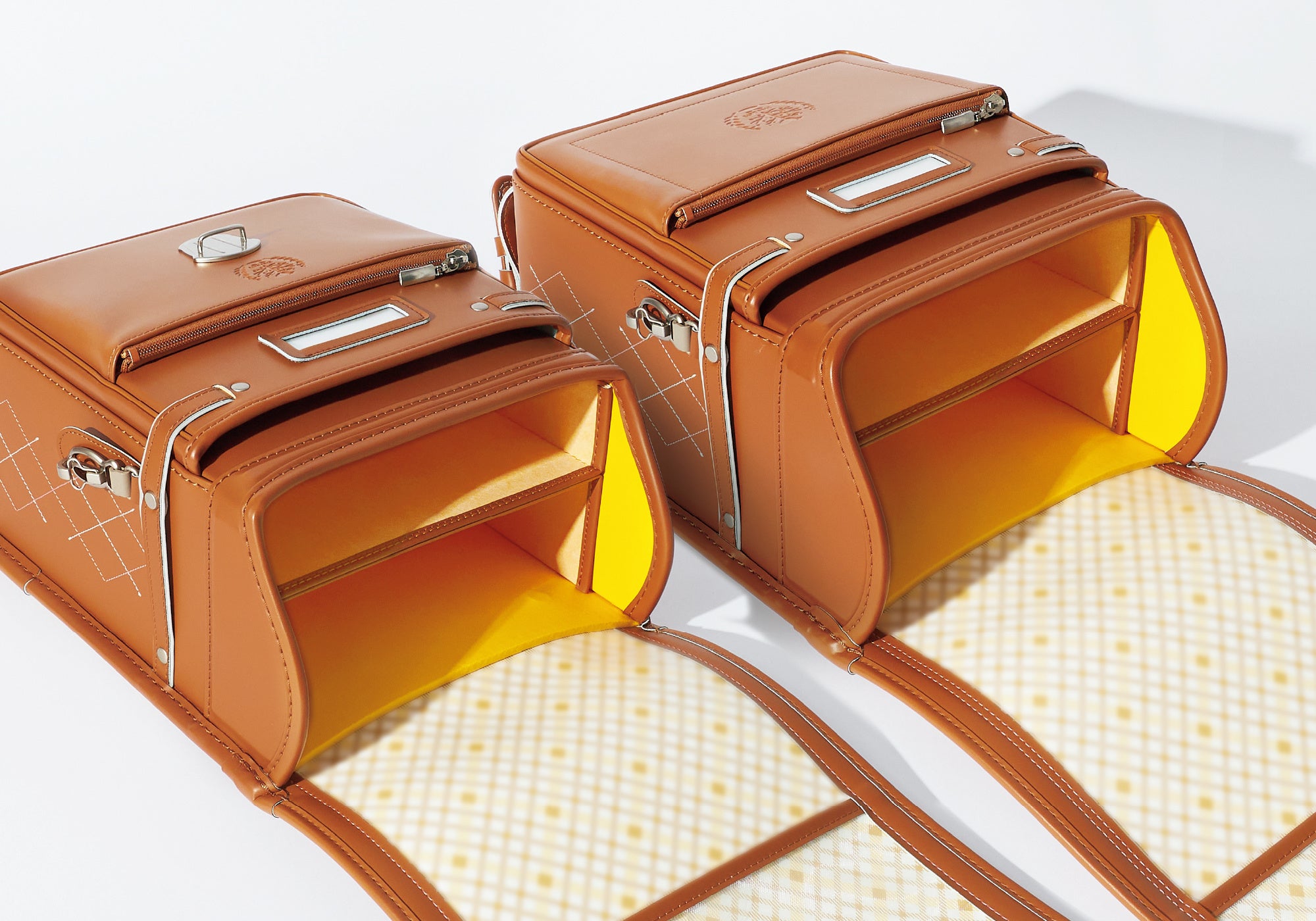 アクタスのスクールバッグは、立てたまま開閉ができるスタイリッシュなハーフカバータイプと、中身をすっぽりと包む安定感と安心感抜群のフルカバータイプ(学習院型)の2種をご用意。定番色であるキャメル、ドルフィンブラック、ワイズネイビー、モードピンクの4色それぞれのサイドには、本体のカラーによってステッチの色を変えたスコットランドの伝統的なアーガイル模様を丁寧な刺繍で施しています。上品さとカジュアルさを兼ね備えた、6年間飽きずにお使いいただけるデザインです。アクタススクールバッグは100年以上も子どもたちに文具を提供してきたコクヨとアクタスのコラボレーションで生まれました。