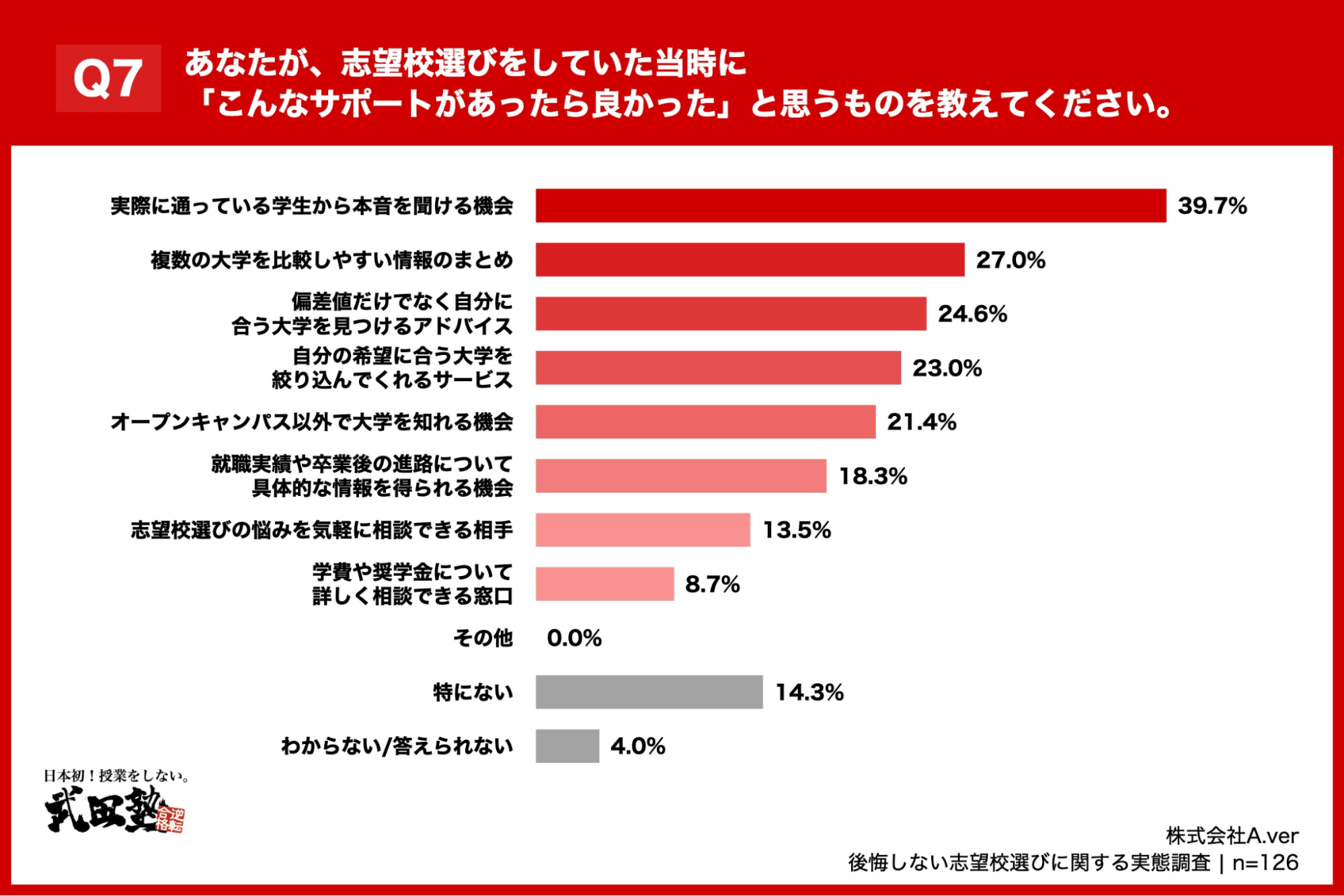 「Q7. あなたが、志望校選びをしていた当時に「こんなサポートがあったら良かった」と思うものを教えてください。(上位3つまで回答可)」(n=126)と質問したところ、「実際に通っている学生から本音を聞ける機会」が39.7%、「複数の大学を比較しやすい情報のまとめ」が27.0%、「偏差値だけでなく自分に合う大学を見つけるアドバイス」が24.6%という回答となりました。