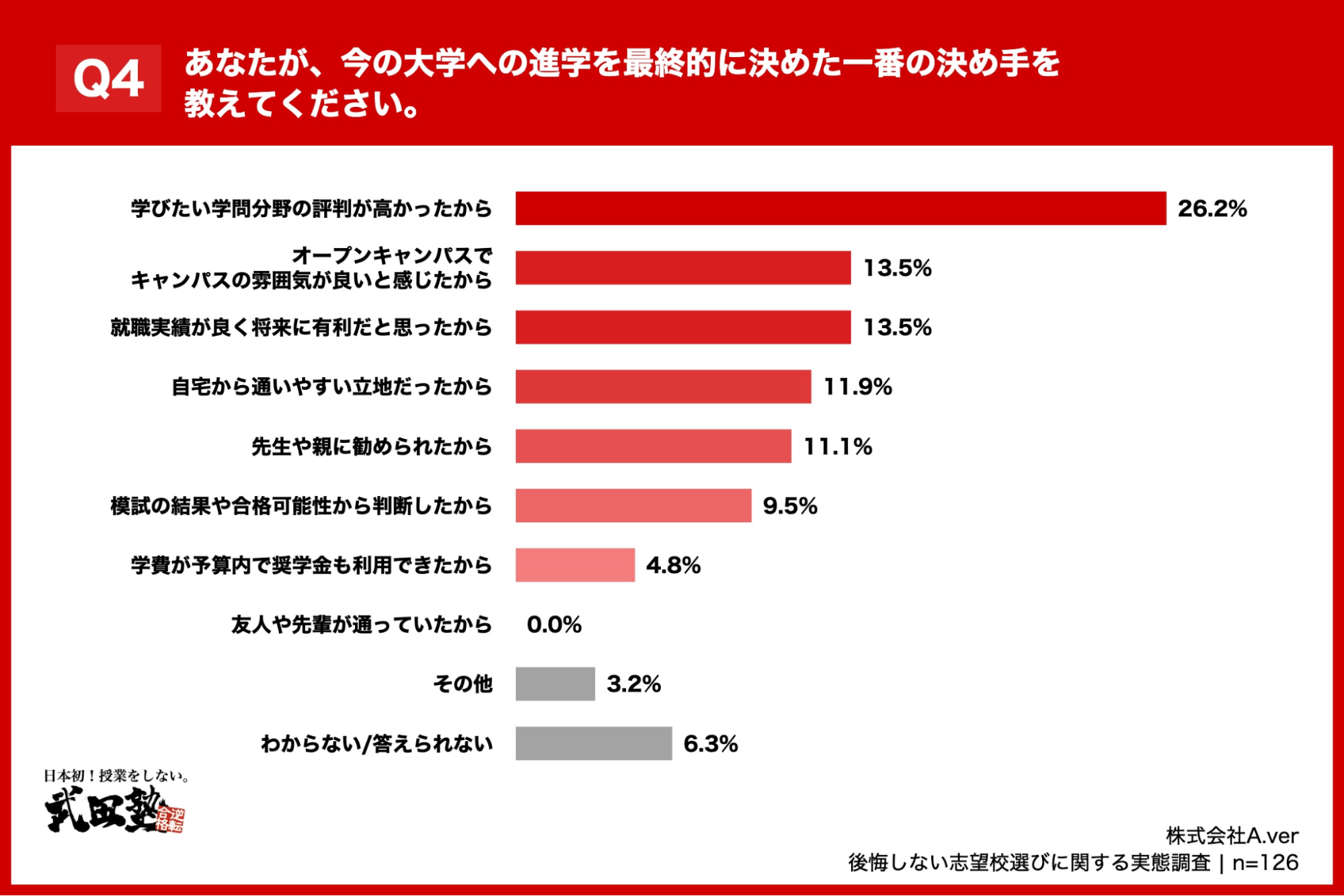「Q4. あなたが、今の大学への進学を最終的に決めた一番の決め手を教えてください。」(n=126)と質問したところ、「学びたい学問分野の評判が高かったから」が26.2%、「オープンキャンパスでキャンパスの雰囲気が良いと感じたから」が13.5%という回答となりました。