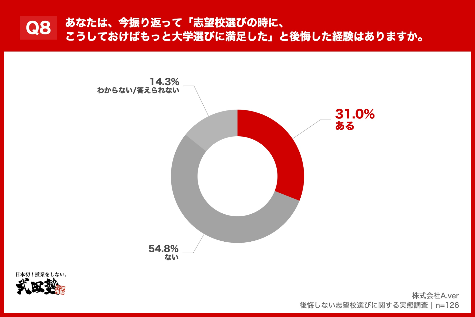 「Q8. あなたは、今振り返って「志望校選びの時に、こうしておけばもっと大学選びに満足した」と後悔した経験はありますか。」(n=126)と質問したところ、「ある」が31.0%、「ない」が54.8%という回答となりました。