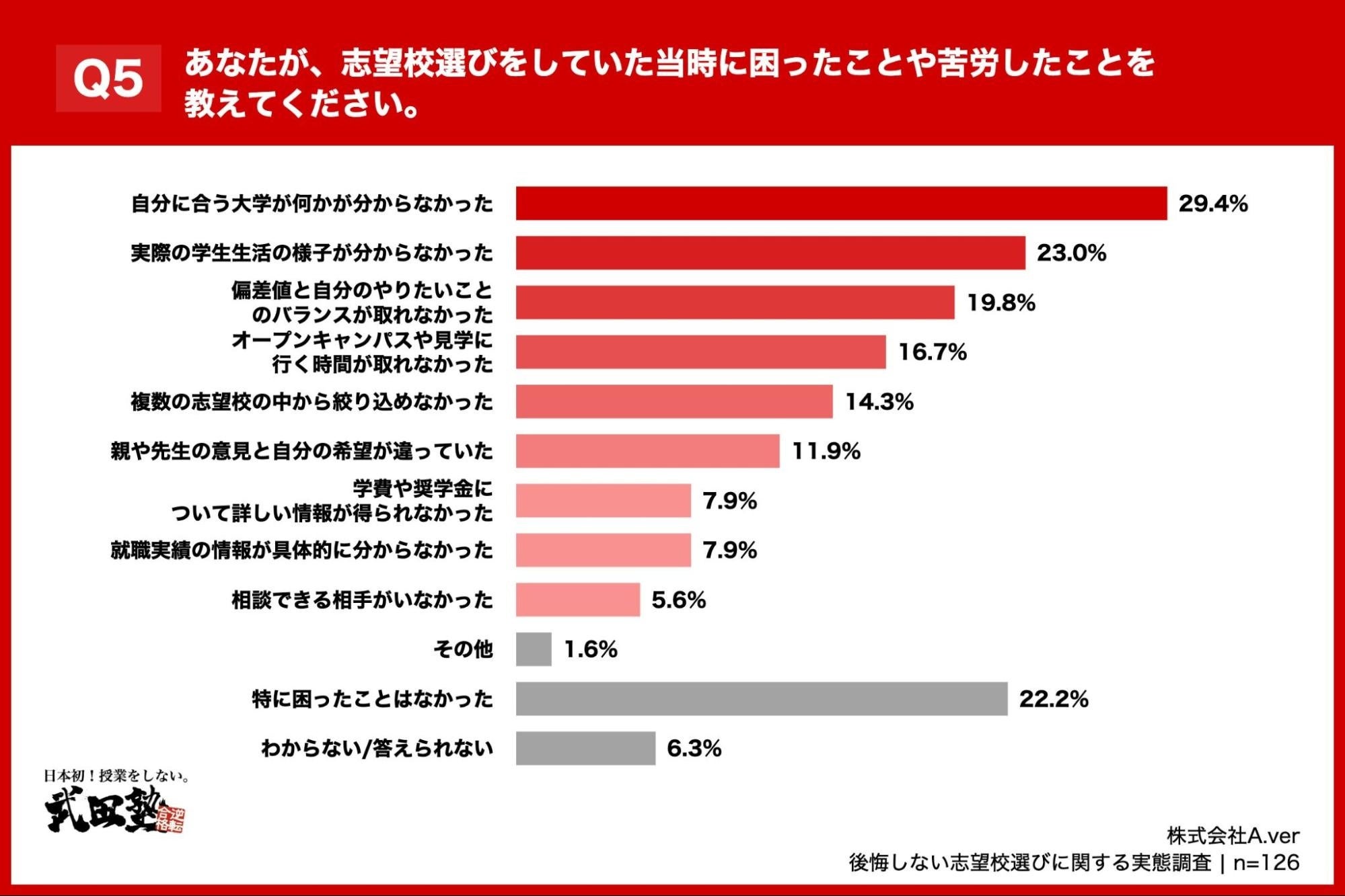 「Q5. あなたが、志望校選びをしていた当時に困ったことや苦労したことを教えてください。(複数回答)」(n=126)と質問したところ、「自分に合う大学が何かが分からなかった」が29.4%、「実際の学生生活の様子が分からなかった」が23.0%、「特に困ったことはなかった」が22.2%という回答となりました。