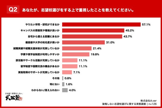 「Q2. あなたが、志望校選びをする上で重視したことを教えてください。(複数回答)」(n=126)と質問したところ、「やりたい学問・研究ができるか」が57.1%、「キャンパスの雰囲気や環境が良いか」が45.2%、「自宅から通える距離にあるか」が43.7%という回答となりました。