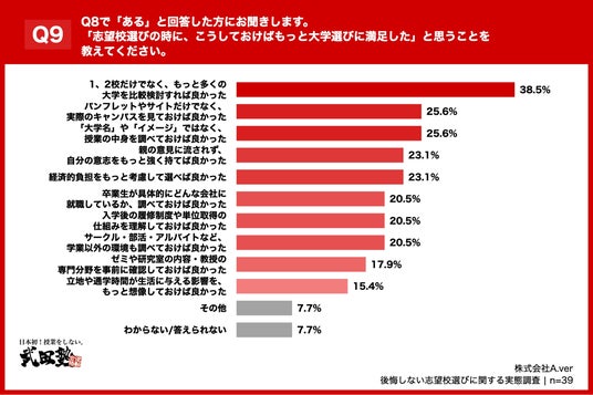「Q9. Q8で「ある」と回答した方にお聞きします。「志望校選びの時に、こうしておけばもっと大学選びに満足した」と思うことを教えてください。(複数回答)」(n=39)と質問したところ、「1、2校だけでなく、もっと多くの大学を比較検討すれば良かった」が38.5%、「パンフレットやサイトだけでなく、実際のキャンパスを見ておけば良かった」が25.6%、「「大学名」や「イメージ」ではなく、授業の中身を調べておけば良かった」が25.6%という回答となりました。