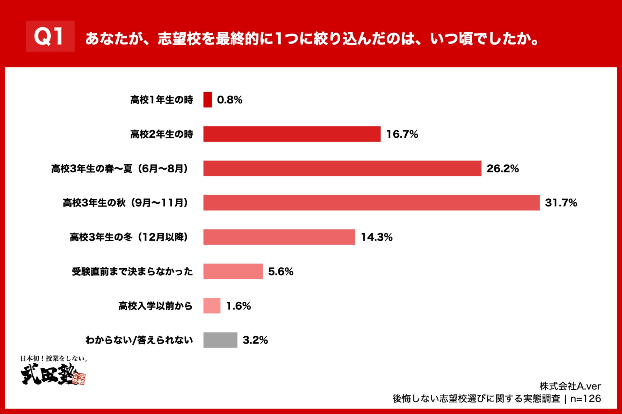 「Q1. あなたが、志望校を最終的に1つ(または2~3つ)に絞り込んだのは、いつ頃でしたか。」(n=126)と質問したところ、「高校3年生の春~夏(6月~8月)」が26.2%、「高校3年生の秋(9月~11月)」が31.7%という回答となりました。