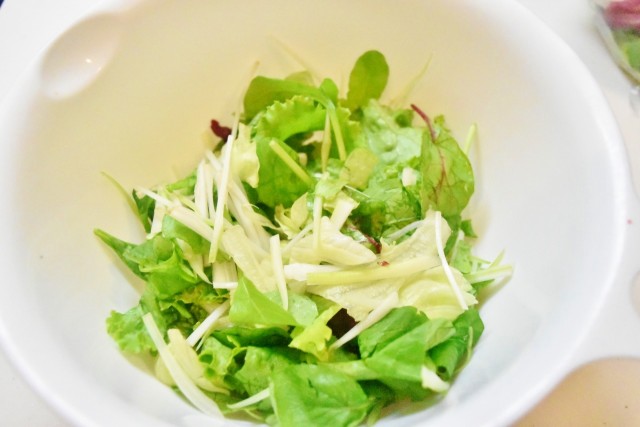 1.セロリを千切りにしたものを、レタスやベビーリーフなどと一緒にボウルで混ぜます。