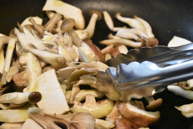 2.キノコをオリーブオイルで炒め、軽く塩コショウをしておきます。