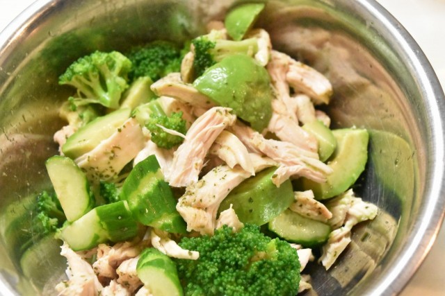 4.茹でたブロッコリー、一口大に切ったきゅうり・アボカドを、チキンと一緒にボウルで合わせます。