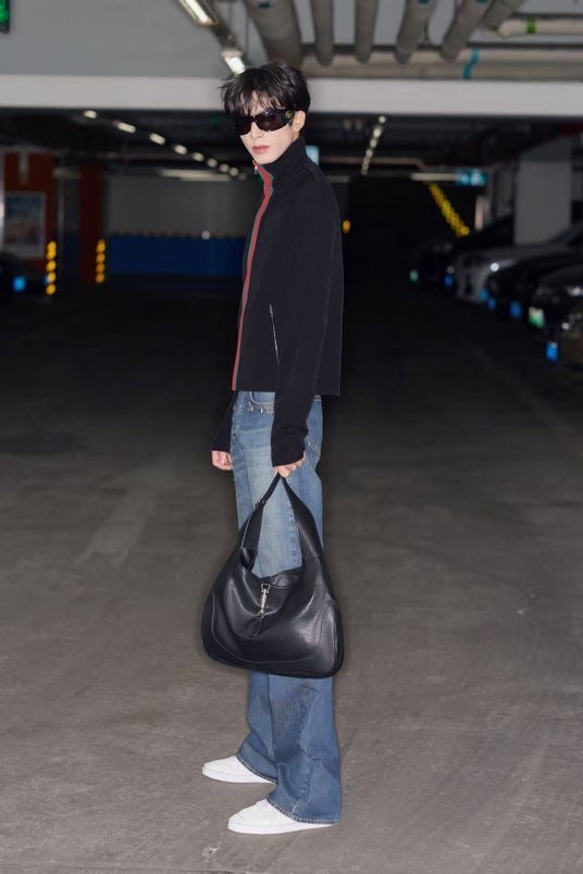 中国の俳優ソン・ウェイロンは、2026年1月28日、中国・北京にて、「ラ ファミリア」コレクションのブラック ストレッチ ナイロン ジップジャケット(ウェブ ストライプ付き)、ホースビット ディテール付きデニムパンツ、ブラックフレーム サングラス、ホワイトレザー〔ストレッチ〕スニーカーを着用し、ブラックレザー〔グッチ ジャッキー 1961〕ショルダーバッグを携えて登場しました。
