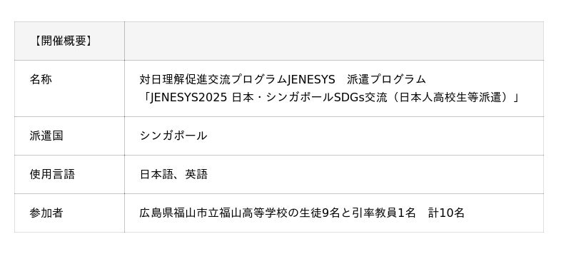 JENESYS派遣プログラムで福山市立福山高等学校の生徒ら10名が「SDGs」をテーマにシンガポールを訪問し、学校交流などの人的交流を通して互いの国や文化について理解を深めつつ日本の魅力を発信します。