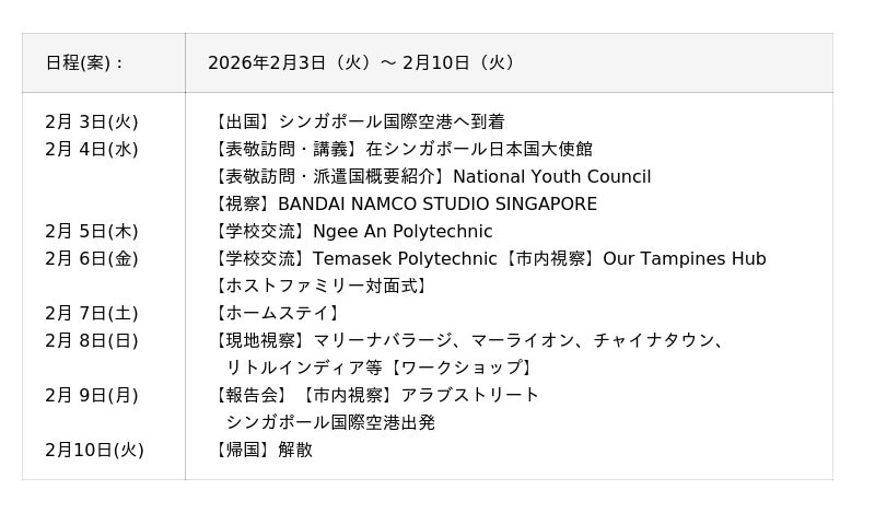 福山市立福山高等学校の生徒9名と引率教員1名が、「SDGs」をテーマにシンガポールを訪問します。現地では、同年代の学生と「SDGs(コミュニティ構築、まちづくり)」をテーマに交流を行い、プレゼンテーションやワークショップを通じて互いの国の魅力について発表し合います。シンガポール最大の統合型コミュニティおよびライフスタイルハブである「Our Tampines Hub」を訪問し、住みやすいまちづくりについて一緒に考える機会を設けます。ホームステイでは家庭生活を体験することで、異なる生活文化や習慣の違いから新たな気付きを得ます。また、現地で活躍する日本企業を訪問することで両国のパートナーシップについて理解を深めます。シンガポールで出会う人々に対して日本の魅力を積極的に紹介することで日本への興味関心を高めてもらい、両国の更なる友好に向けたネットワーク強化にも取り組みます。