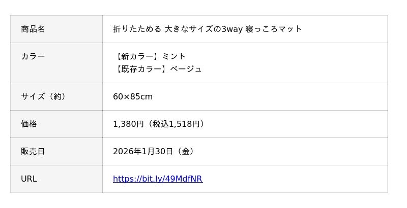 株式会社赤ちゃん本舗(本社:大阪市中央区 http://www.akachan.jp)は、アカチャンホンポ オリジナル商品の「折りたためる 3way 寝っころマット」より数量限定※2の新カラーを全国のアカチャンホンポとオンラインショップ(https://shop.akachan.jp)にて2026年1月30日(金)から販売いたします。おふろタイムの赤ちゃんの洗い場や待機場所、お着替えに活躍するほか、おむつ替えやアウトドアにもご利用いただけます。