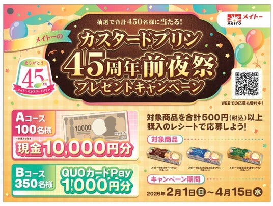 本キャンペーンは、「メイトーのカスタードプリン」をはじめとした対象商品を合計500円(税込)以上購入したレシートで、ハガキ貼付もしくはWebで応募していただくと、45周年にちなんで抽選で合計450名様に賞品が当たるキャンペーンです。抽選で100名様に現金1万円分、350名様にQUOカードPay1,000円分をプレゼントいたします。皆様からのご応募お待ちしています。