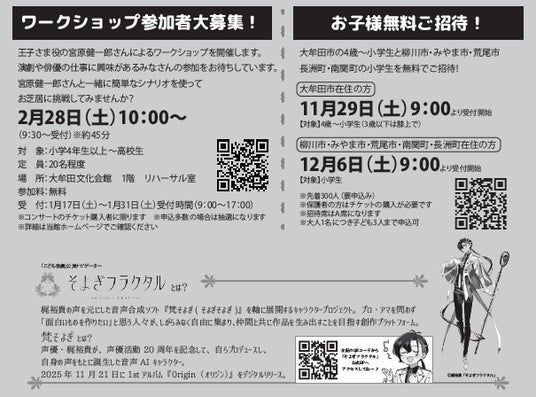 2026年2月28日(土)に大牟田文化会館にて、世界的ベストセラーの名作「星の王子さま」を生演奏と朗読で楽しむコンサートを開催します。クラシックの名曲から子どもたちにも親しみのあるJ-POPや楽しい手遊びなど、一緒に歌って参加できる曲がもりだくさん。