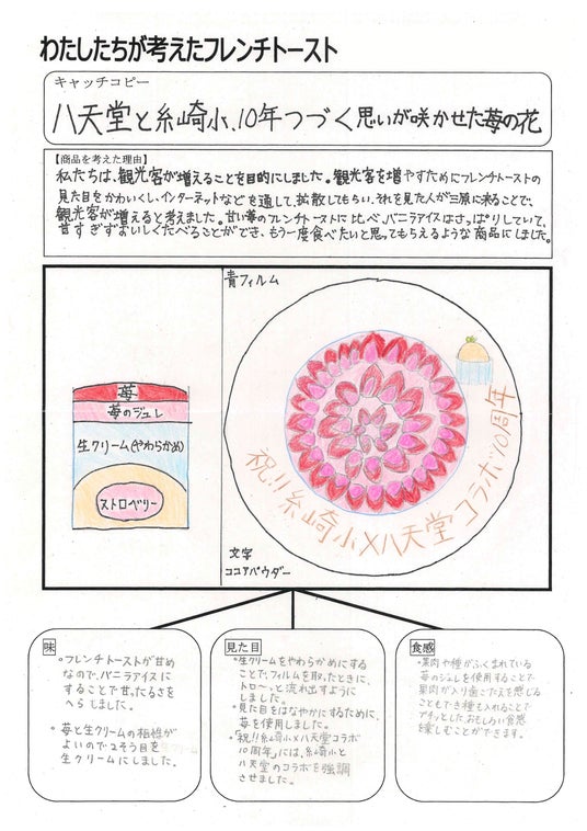 地元の皆様に親しまれるメニューをテーマに、児童(5、6年生56名)にアイデアを考案いただきました。児童8チームによるコンセプトや見た目、味わいに関するプレゼン大会を経て、数ある素敵なアイデアの中から『苺のフレンチトースト』『三原だるまフレンチトースト』の2品が決定しました。