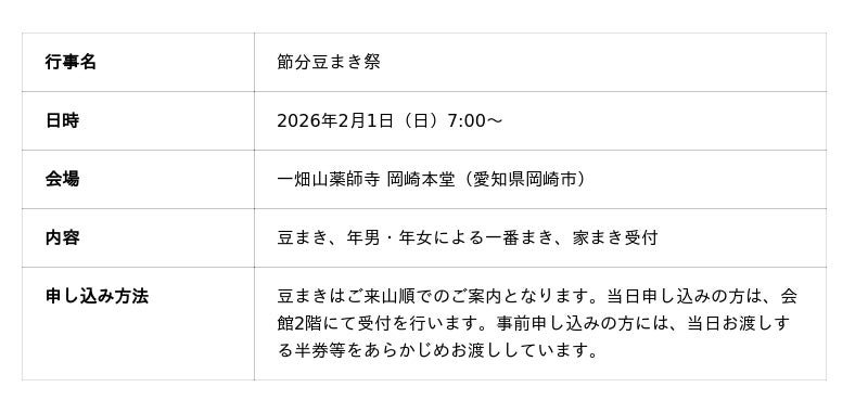 一畑山薬師寺は、2026年2月1日(日)午前7時より、岡崎本堂にて「節分豆まき祭」を開催いたします。節分豆まき祭は、一年の厄を祓い、新たな年の無病息災と飛躍を願う恒例行事です。ご参詣された方全員が豆まきにご参加いただけます。