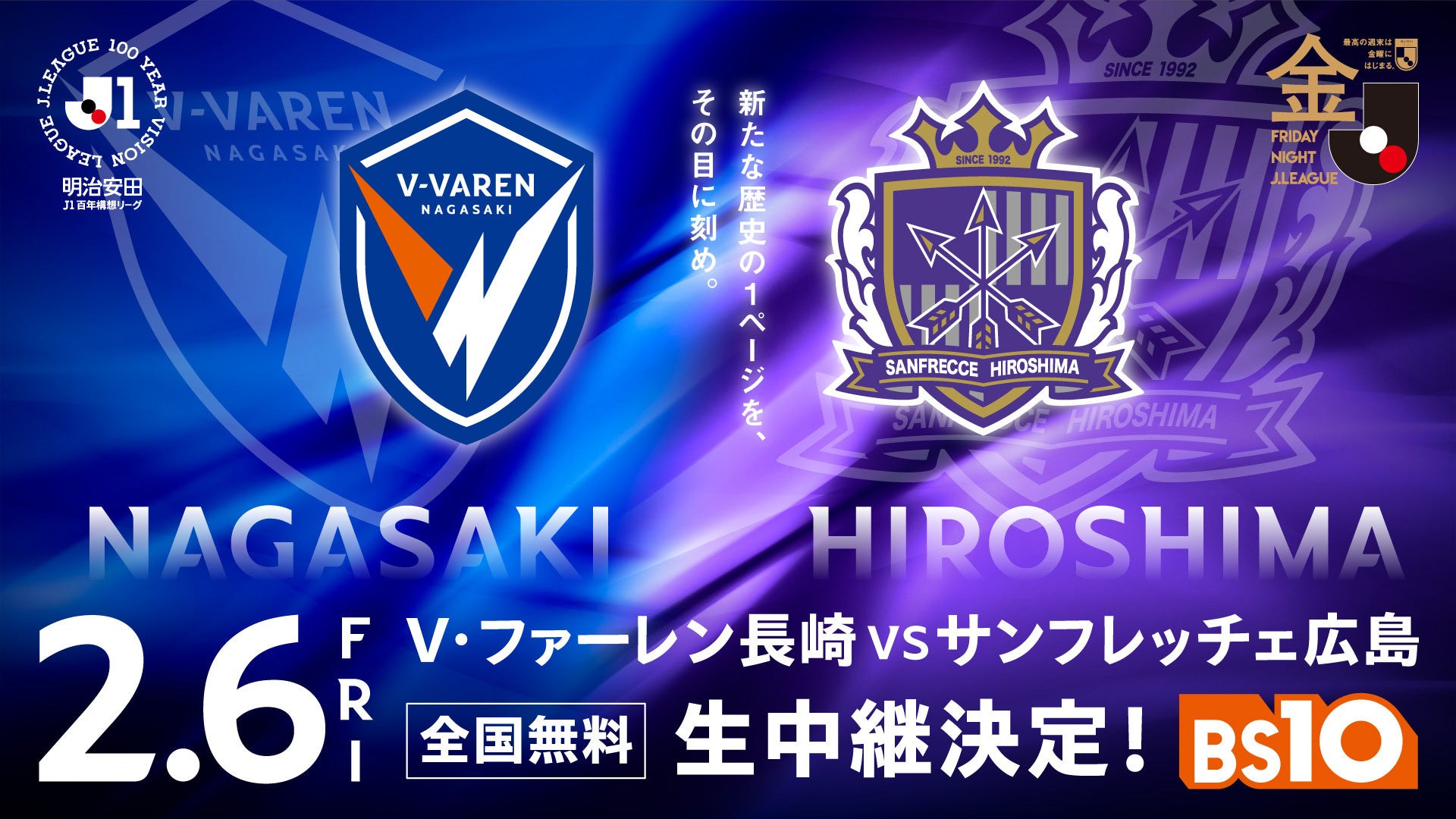全国無料のBS放送局『BS10(読み:ビーエステン)』は、2月6日(金)よる7時キックオフの『明治安田J1百年構想リーグ 地域リーグラウンド WEST第1節 V・ファーレン長崎 vs サンフレッチェ広島』を全国無料で生中継いたします。当日はよる6時から、両クラブの昨シーズンハイライトや明治安田J1百年構想リーグの見どころ&展望を豪華OB解説陣が徹底解説するスペシャル企画をお届け!8年ぶりにJ1昇格を果たしたV・ファーレン長崎と、Jリーグ屈指の名門 サンフレッチェ広島との「PEACE MATCH」は2018年8月以来の対戦。平和への願いを込めた注目の一戦を、ぜひ生中継でお楽しみください!