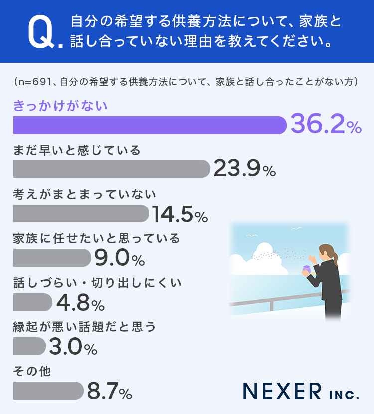 今回の調査では、自分が望む供養方法について家族と話し合った経験がある人は約15%にとどまりました。「きっかけがない」「まだ早い」と感じている人が多い実情が見えてきました。