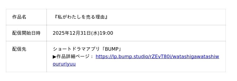 『私がわたしを売る理由』は、経済面や家庭環境の理由から“パパ活”を始める女性たちのリアルをオムニバス形式で描くヒューマンドラマ作品で、コミックスの累計部数は50万部(※)を突破しています。本作は実写化もされ、ショートドラマアプリ「BUMP」にて好評配信中です。映像でもパパ活のリアルな実態と、スリリングな愛憎劇をお楽しみください。